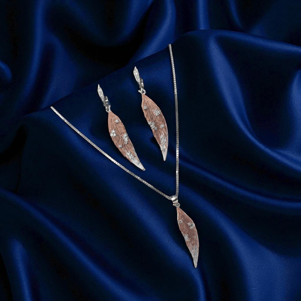 - DIMENSIONS: Feather pendant measures approximately 4.5 cm in length, complemented by matching earrings and a sterling silver chain