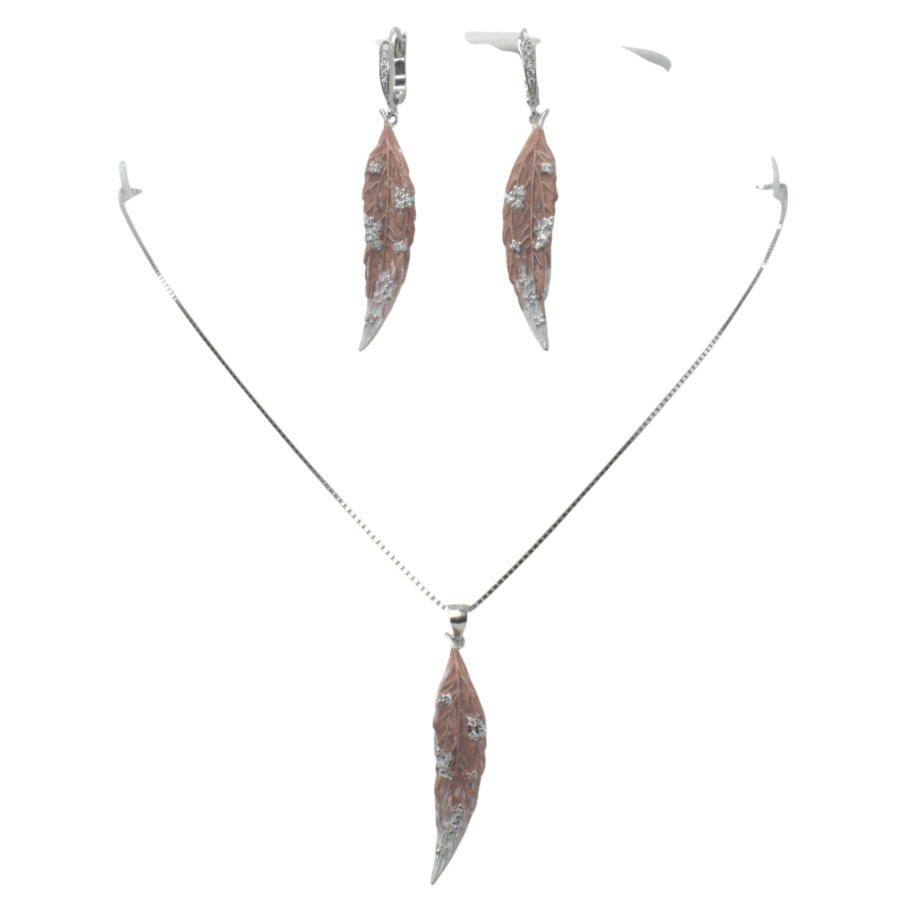 - DIMENSIONS: Feather pendant measures approximately 4.5 cm in length, complemented by matching earrings and a sterling silver chain