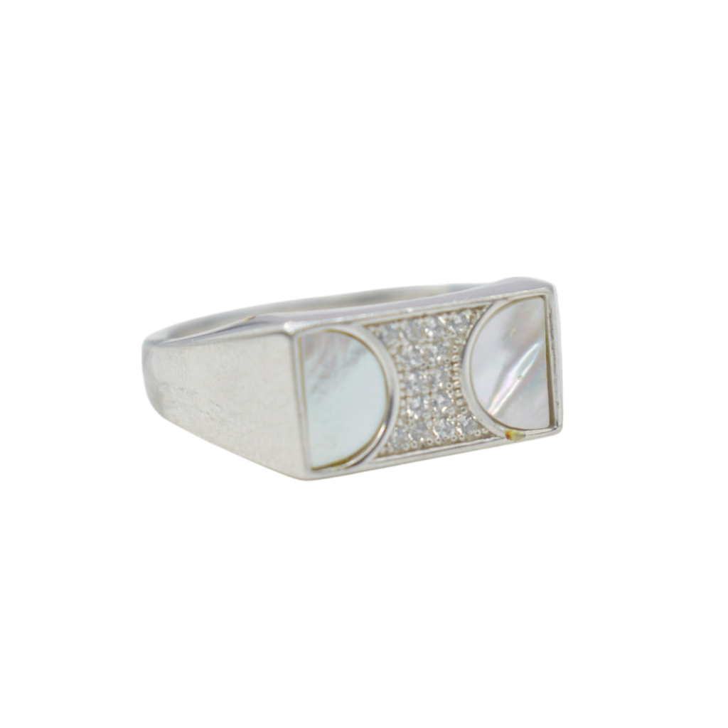 - DISTINCTIVE STYLE: Contemporary geometric pattern combines half-moon mother of pearl elements with brilliant stones for a modern aesthetic