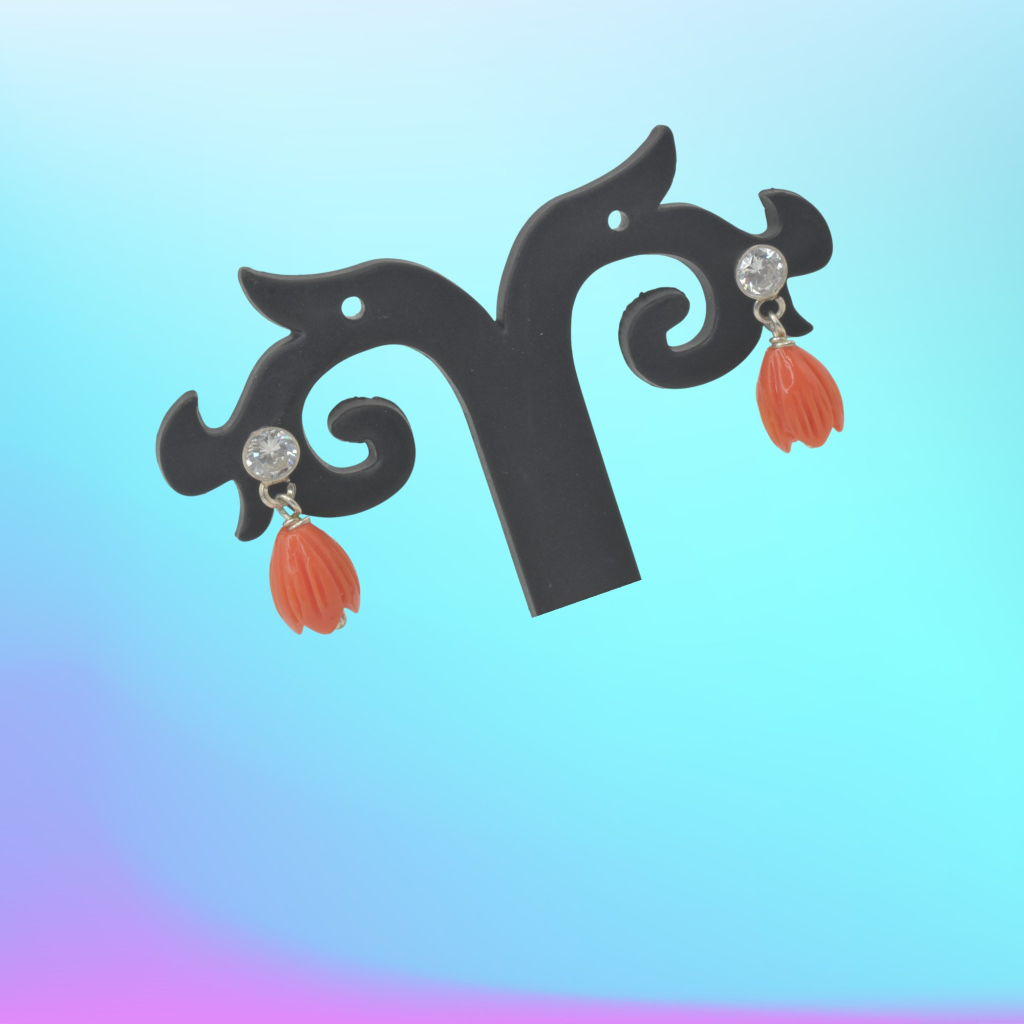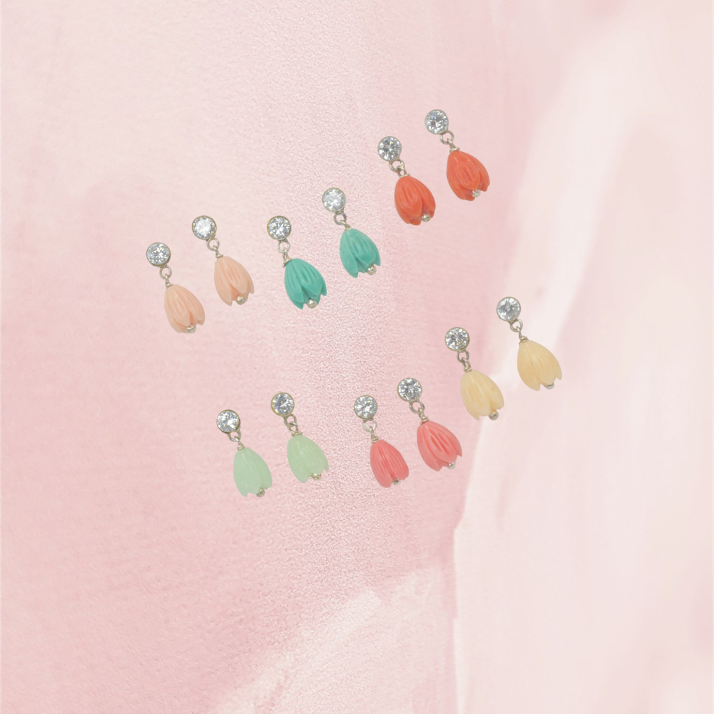 - ELEGANT DESIGN: Set of 6 pairs of dangle drop earrings featuring sparkling cubic zirconia studs with colourful carved tulip-shaped drops in peach, turquoise, coral, mint green, pink, and cream